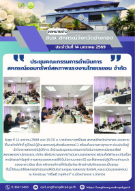 วันพุธ ที่ 14 มกราคม 2569 เวลา 15.00 น. นางฉันทนา ฤทธิ์ไธสง สหกรณ์จังหวัดอ่างทอง มอบหมายให้ นายกิตติศักดิ์ ภูวิโรจน์ ผู้อำนวยการกลุ่มส่งเสริมสหกรณ์ 1 พร้อมด้วยนางสาวจุฑามาศ อ่วมประดิษฐ์ นักวิชาการสหกรณ์ปฏิบัติการ เข้าร่วมประชุมคณะกรรมการดำเนินการสหกรณ์ออมทรัพย์สหภาพแรงงานไทยเรยอน จำกัด เพื่อรับทราบผลการดำเนินงานของสหกรณ์ พร้อมทั้งให้คำแนะนำในเรื่องการจัดสรรกำไรสุทธิ การลงทุนของสหกรณ์ให้เป็นไปตามมาตรา 62 และให้สหกรณ์ปฏิบัติตามคำแนะนำของนายทะเบียน เรื่อง หลักเกณฑ์การให้เงินกู้แก่สมาชิกอย่างรับผิดชอบและเป็นธรรม ทั้งนี้ ได้แนะนำให้สหกรณ์ดำเนินงานให้เป็นไปตามกฎหมายสหกรณ์ ข้อบังคับ และระเบียบของสหกรณ์ ณ ห้องประชุม “ศรีโพธิ์ วายุพักตร์” อ.เมืองอ่างทอง จ.อ่างทอง
